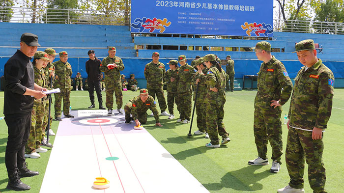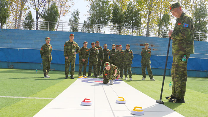 在【旱地冰壺】項(xiàng)目中,八個(gè)小組的隊(duì)員們一邊商榷對(duì)敵戰(zhàn)術(shù),一邊進(jìn)行任務(wù)分配。隨著一聲哨響,兩個(gè)賽隊(duì)同時(shí)開賽。隊(duì)員們?nèi)褙炞、凝神靜氣,向前邁步?jīng)_刺,揮動(dòng)手臂擲壺,冰壺按照隊(duì)員們?cè)O(shè)想的路線擊打到對(duì)方的冰壺,使其滑出得分圈并穩(wěn)穩(wěn)地停留在中心點(diǎn),成功得分,大家歡呼雀躍,圍觀隊(duì)員們也紛紛叫好,掌聲、歡呼聲此起彼伏,好不熱鬧。