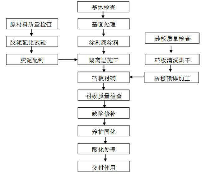 進(jìn)行襯砌瓷磚時(shí),磚板錯(cuò)縫排列,同層磚縫應(yīng)錯(cuò)開磚板寬度的1/3~1/2;采取揉擠法襯磚,灰縫應(yīng)飽滿密實(shí),灰縫表面隨時(shí)壓光;立面磚連續(xù)襯砌高度,應(yīng)與膠泥膠凝時(shí)間相適應(yīng),防止砌體受壓變形;平面襯磚,應(yīng)防止滑動;襯磚結(jié)合層厚度為6-8㎜,縫寬為3-4㎜。